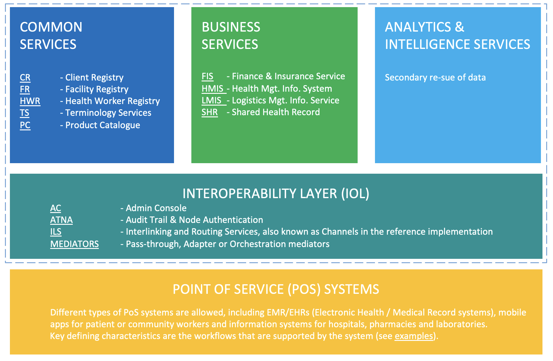 The top layer of framework comprises three distinct domains. Common Services (blue) include a variety of registry services that are designed to uniquely identify and track unique patients, facilities, healthcare products, and terminology that are used throughout the health data commons. Business Service (green) are designed to support the delivery of care within the health system. The District Health Information System version 2, for example, is a well-known and widely used Health Management Information System for collecting, analyzing, visualizing and sharing data through combining data from multiple PoS systems for a given geography or jurisdiction.6