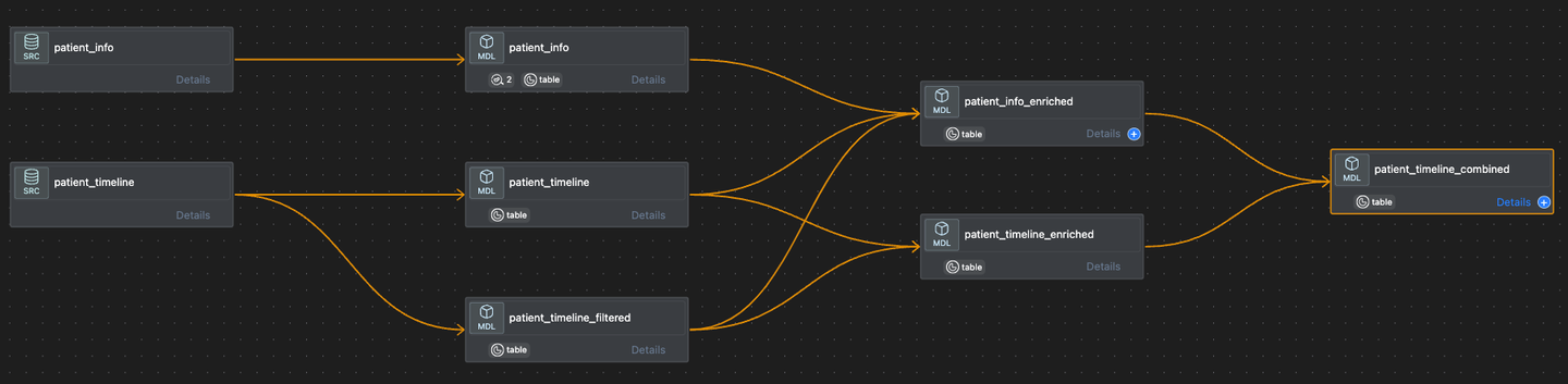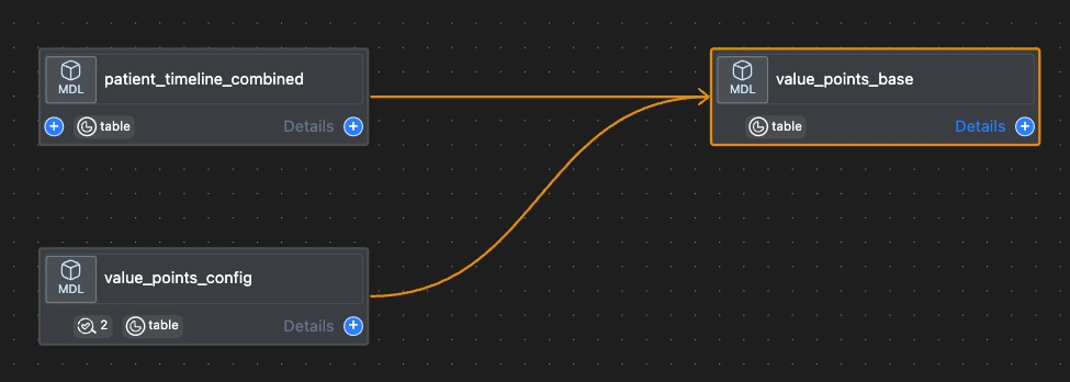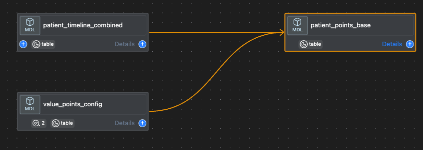 , which serves as a building block for subsequent models used in calculating value points. The transformations applied to the base models include, filtering the patient events data based on age, and adding information that flags high-risk patients based on their captured conditions. The code for the intermediary models used to create the patient_timeline_combined