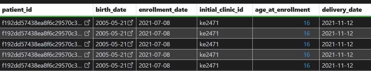 The table below is an output from the code above and shows part of the patient_timeline_combined