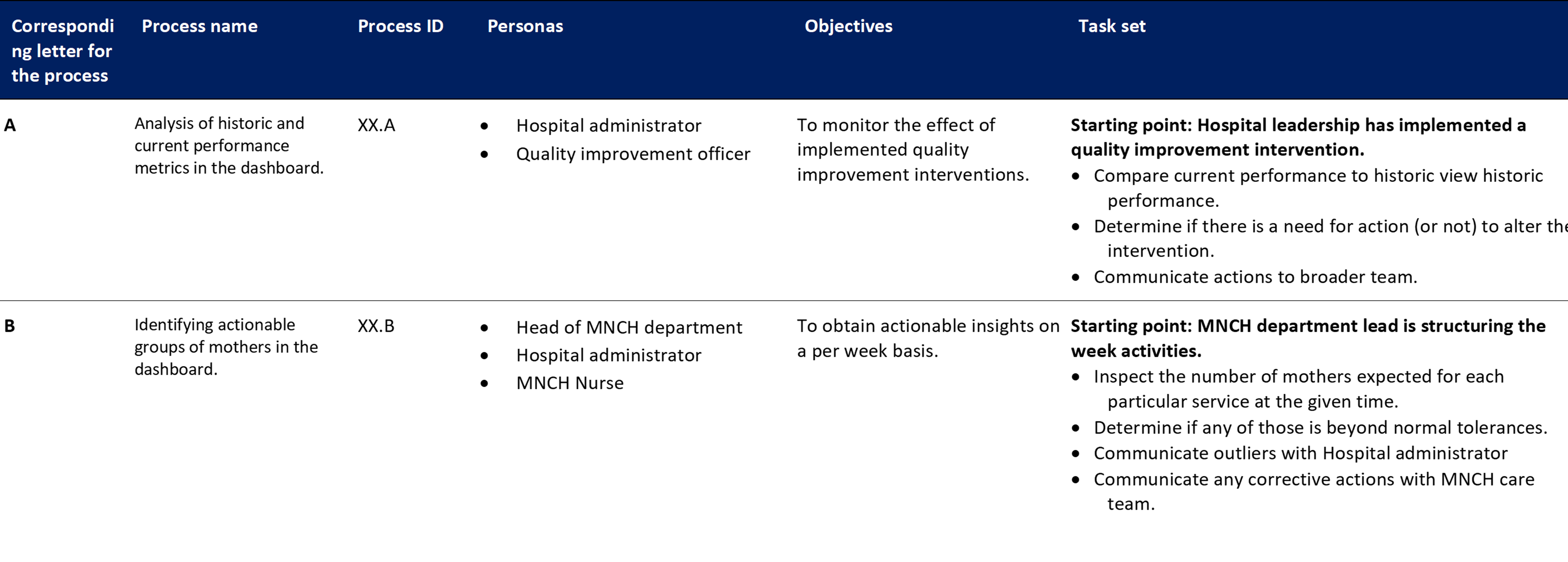 Note: This DAK does not intend to focus on the process of registration of patients and execution of ANC touchpoints, as the main digital system described in this DAK (the dashboard) is not used during these processes. The corresponding business process and workflows have been described in the “Digital Adaptation Kit for Antenatal Care: Operational requirements for implementing WHO recommendations in digital systems”.