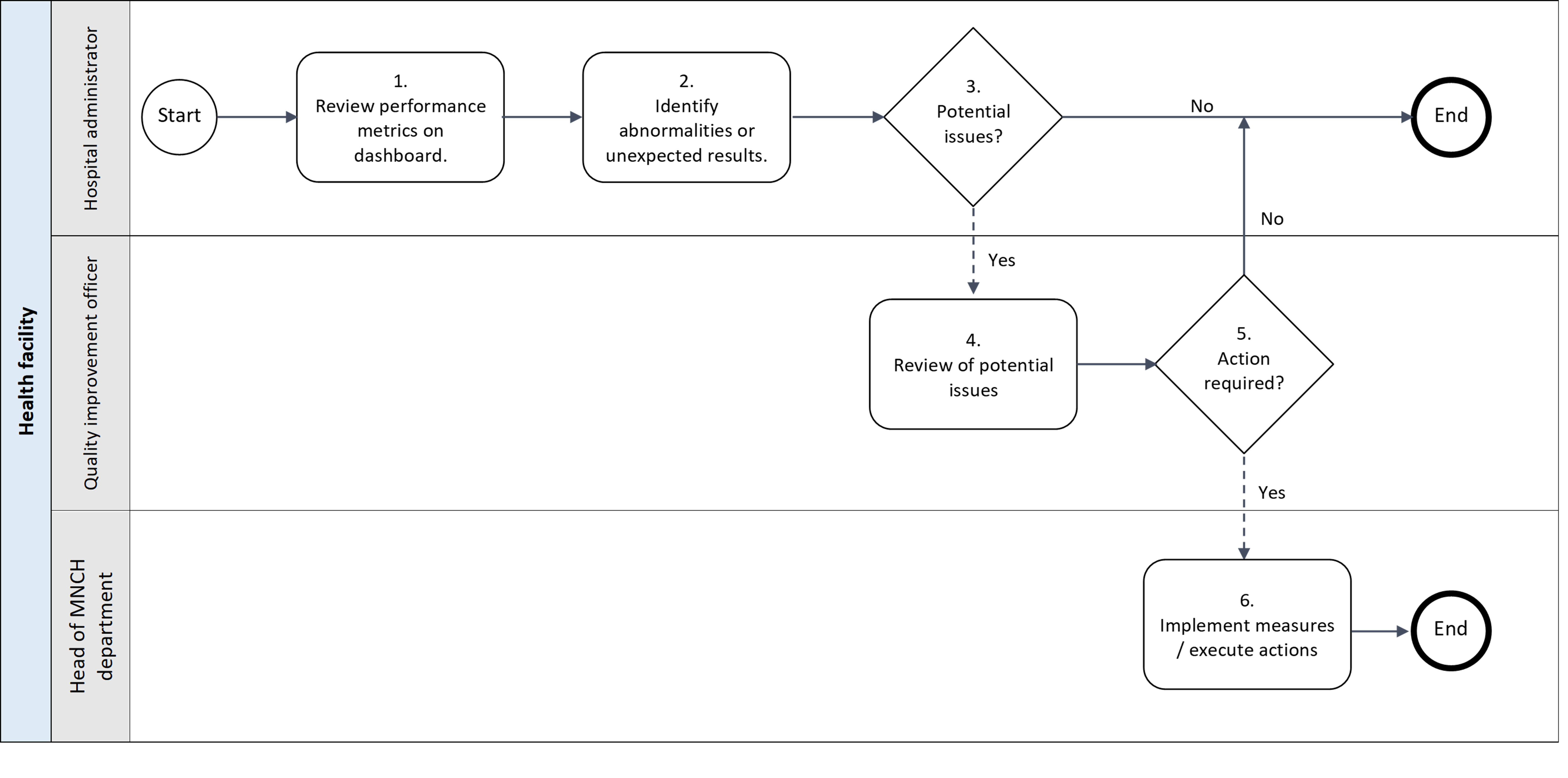 General note: For this workflow, it is expected that previously in time the hospital leadership has identified a performance area of weakness and implemented a quality improvement intervention to improve that area of performance. There is no fixed frequency for viewing the performance metrics in the dashboard.