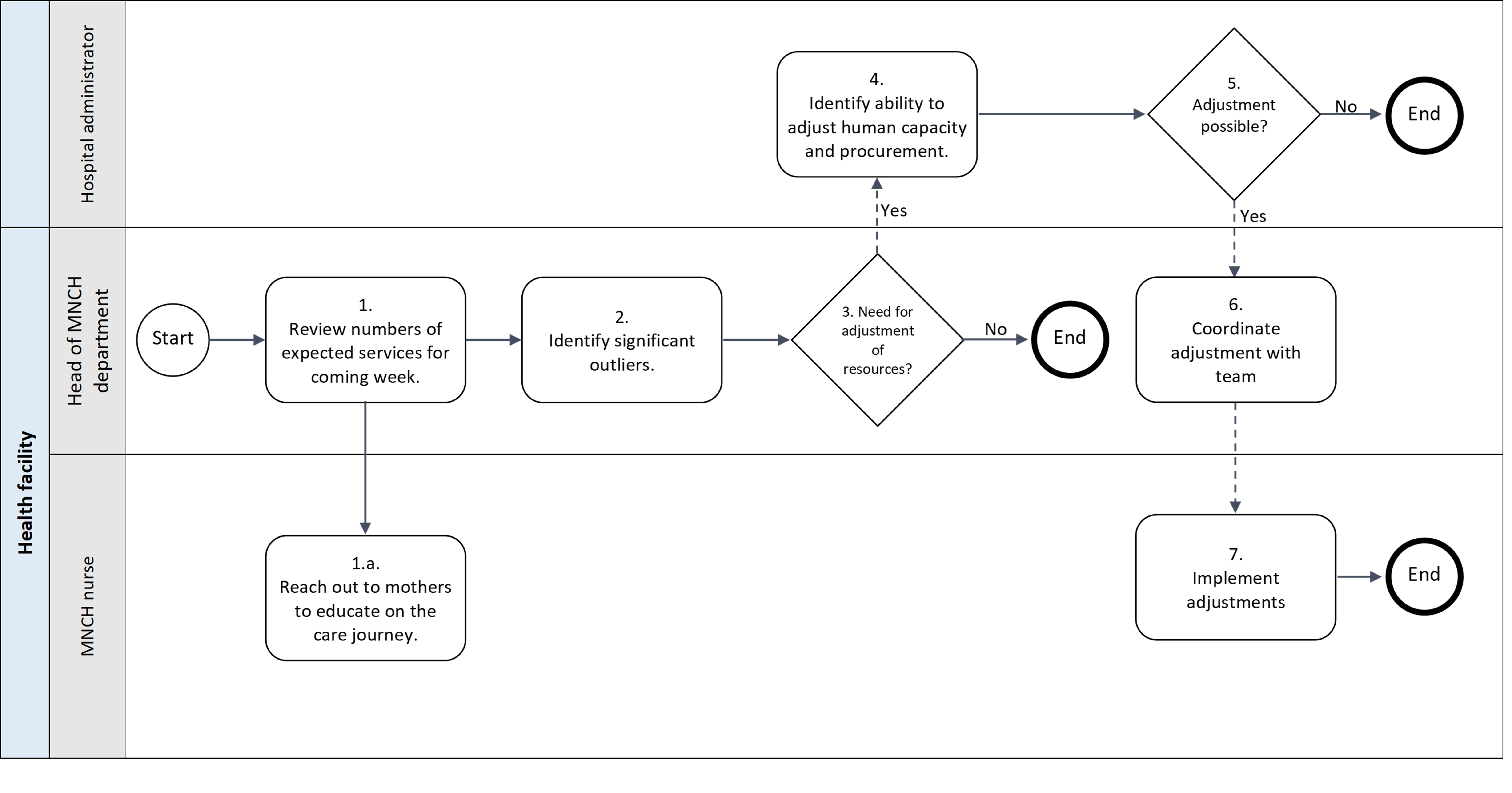 - If they can adjust resources, the instruction is given to the head of MNCH to coordinate the changes.